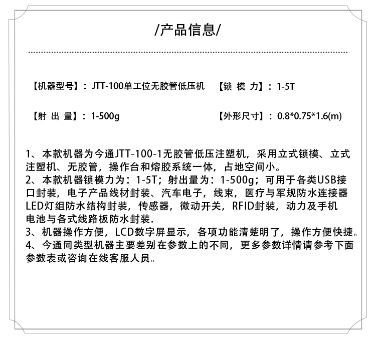 小型低壓注塑選哪種型號(hào)比較好?-今通機(jī)械